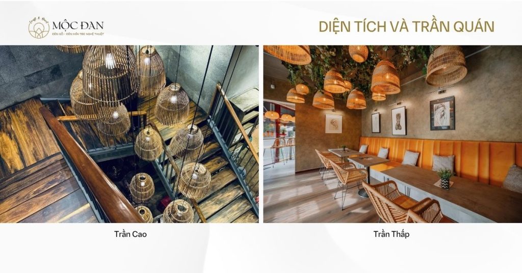 • Trần cao → Chọn đèn thả quán cafe dạng chùm hoặc cụm.