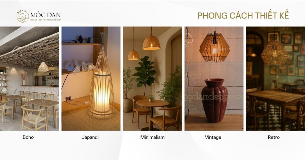 • Boho, Wabi-sabi, Tropical: Chọn đèn mây tre đan hoặc đèn dây trang trí.