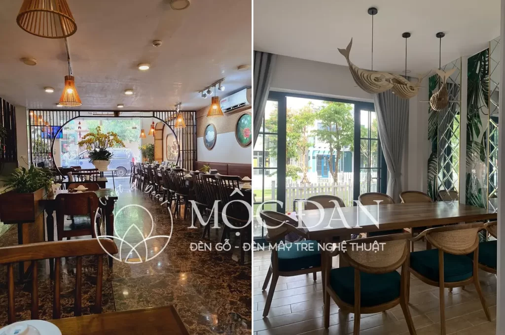 - Nhà hàng, quán ăn, café: làm đèn thả giữa không gian làm tăng thêm yếu tố tự nhiên hoặc huyền ảo, khiến khách hàng cảm thấy thư giãn hoặc như đang khám phá, trầm trò thế giới tự nhiên.