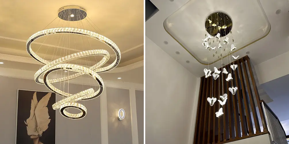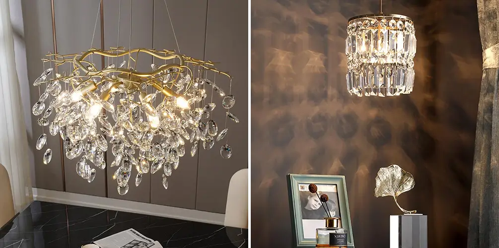 Đèn thủy tinh thường là lựa chọn hàng đầu cho không gian sang trọng nhờ vào vẻ đẹp lung linh và khả năng khuếch tán ánh sáng tốt. Đèn mây tre có ưu điểm đa dạng mẫu mã cũng như kích thước nên chỉ cần biết phối hợp nội thất thì phù hợp với hầu hết mọi không gian, kể cả không gian đòi hỏi sự xa hoa, sang trọng nhưng đầy tinh tế.