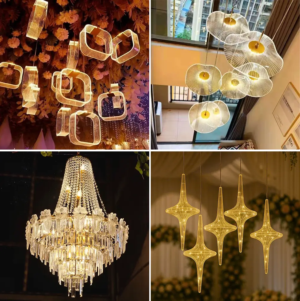 - Ứng dụng: Đèn thủy tinh thường được sử dụng trong các không gian cao cấp như biệt thự, sảnh khách sạn, nhà hàng tiệc cưới, hoặc các khu vực tiếp đón sang trọng cần sự lộng lẫy, xa hoa.