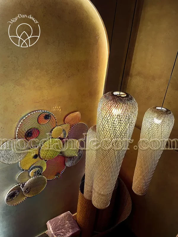 - ⚬ Ánh sáng dịu nhẹ tỏa ra từ những sợi tre tự nhiên, tạo nên một không gian ấm cúng và thư thái.